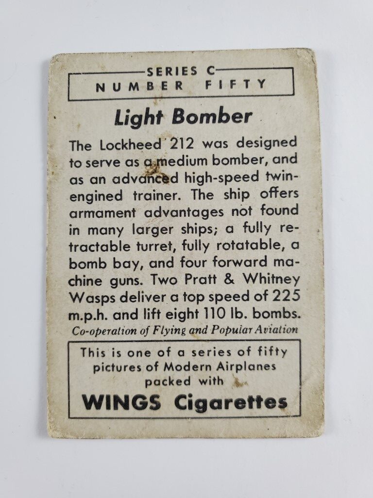1942 Wings Cigarettes Modern American Airplanes Series C T87C Vintage Card #50 Marked on back – Lockheed 212 Demonstrator