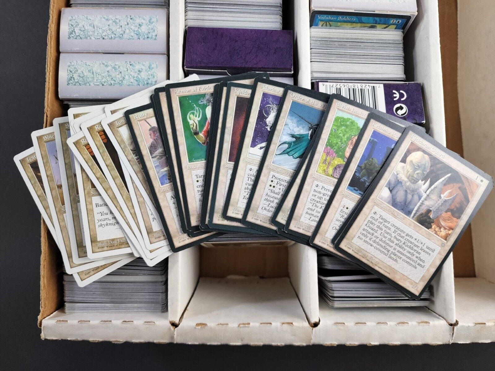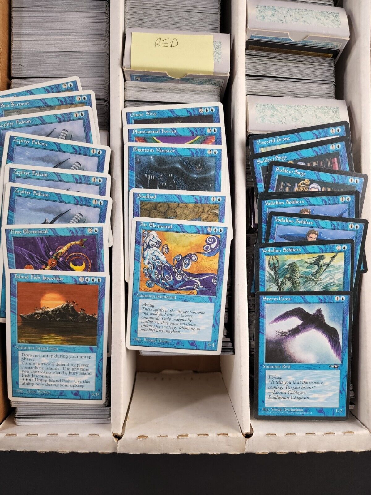 Lot of about 3200 Magic the Gathering Trading Cards. The most recent year I saw was 1997 so everything is ’97 or earlier. This is a completely untouched collection, meaning it has not been picked through, not one card has been removed. From what I saw the card conditions look to be about 80% lightly played to mint condition. Like I said this lot of cards has not been gone through, I’ve only seen what I’ve taken out for pictures and the few cards I did look up were $2, $5, $10 and up. I estimate this vintage collection to be around 3000-3200 cards based on the space taken up and how many cards a row holds. The boxes in between the sections are empty and were most likely used for holding different decks but are now separating the cards by color and how ever else they have been sorted. The lot includes cards from all the different colors. I only pulled out a small pinch of cards from a few of the sections to use to take pictures of for this listing and did not come across any lands in the cards that were pulled out. I’m sure this lot can be pieced out and sold for many multiples more than the hammer price but I unfortunately don’t have the time as of now. You will receive a card storage box with the cards and they will be safety packed to ensure a safe delivery. I cannot go through and take pictures of everything so please don’t ask. Goodluck bidding on this lot.