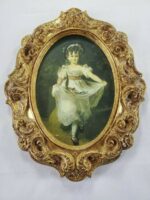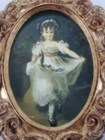 Miss Murray by Thomas Lawrence 1826 – Young Girl Courtesy Fine Art Print displayed behind glass in a beautiful Gold Leaf Frame. The outer measurements are 10″ top to bottom 8″ left to right and the inner measurements are 7″ top to bottom 5″ left to right. The back of the frame says A Decorative Craft – Florentia – Hand Made in Italy with the number 1415.