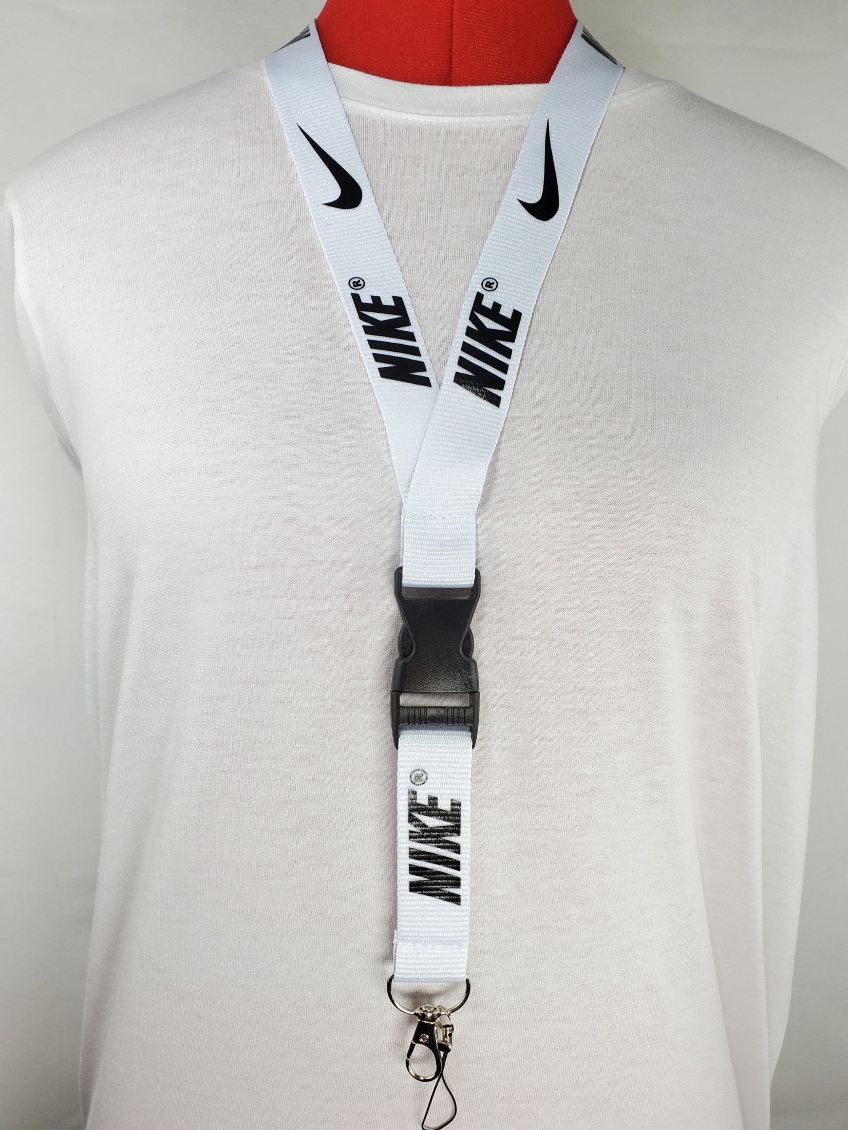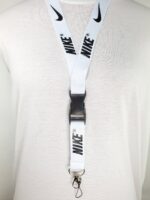 Nike White & Black Detachable Lanyard and Metal Clasp. Take your game and your work to the next level with this stylish lanyard. The lanyard coloring is white and the logo coloring is black. The lanyard measures a total length of 22 inches (56cm) and a 1 inch (2.5cm) strap width comfortably fitting adults. It features a detachable plastic buckle clip and a metal clasp at the end of the strap which is great for keys, ID’s, badges, name tags, cameras and more! This listing is for a single quantity lanyard per order. Discounts up to 15% off are available for multiple lanyards purchased. Take a look at our other items for sale for additional colors and designs.