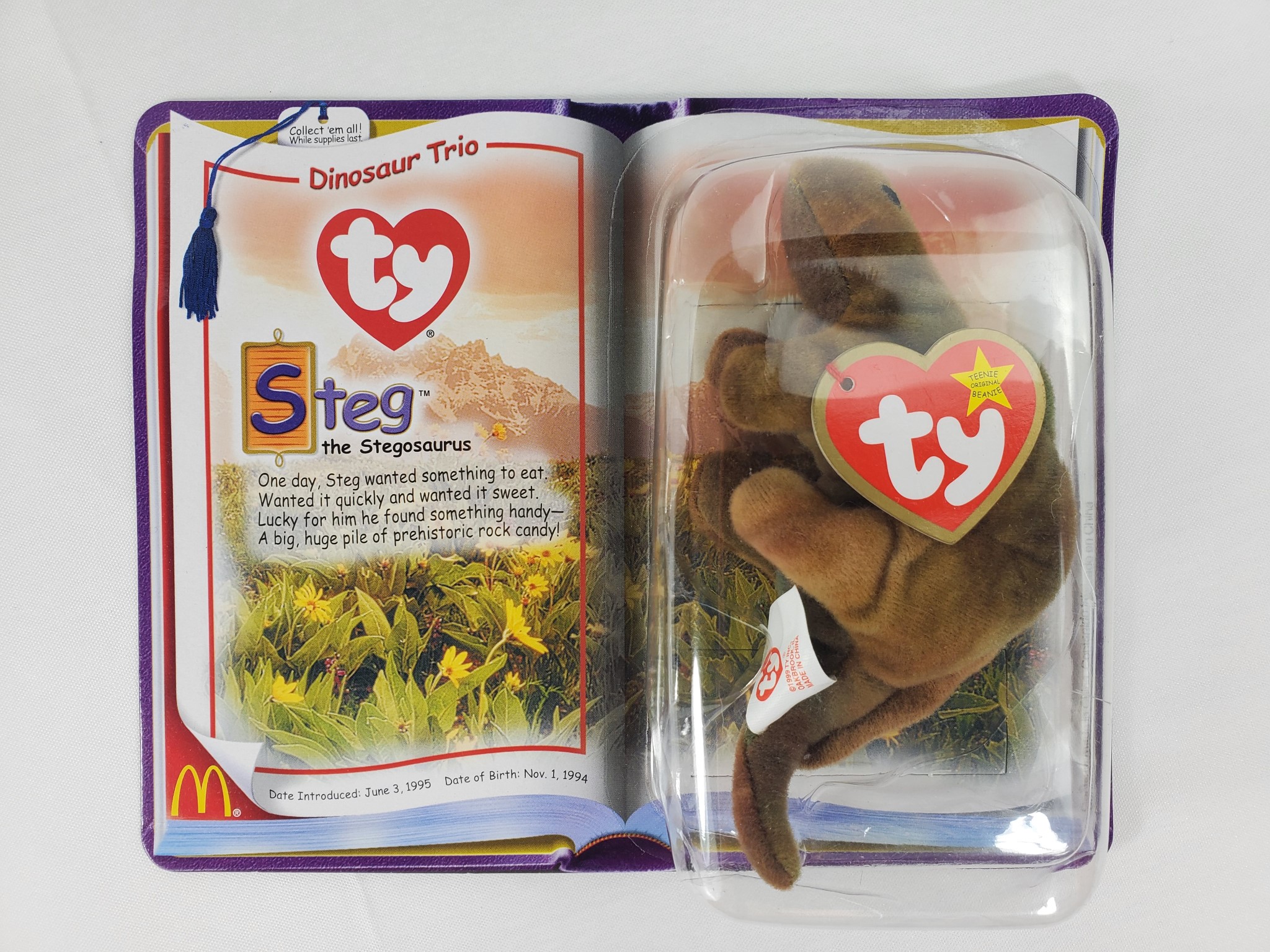 Steg The Stegosaurus Ty Dinosaur Trio Teenie Beanie Babies McDonalds USA 2000 Promotion Style Number 4087 7.25″ Dinosaur in original mint condition sealed packaging.