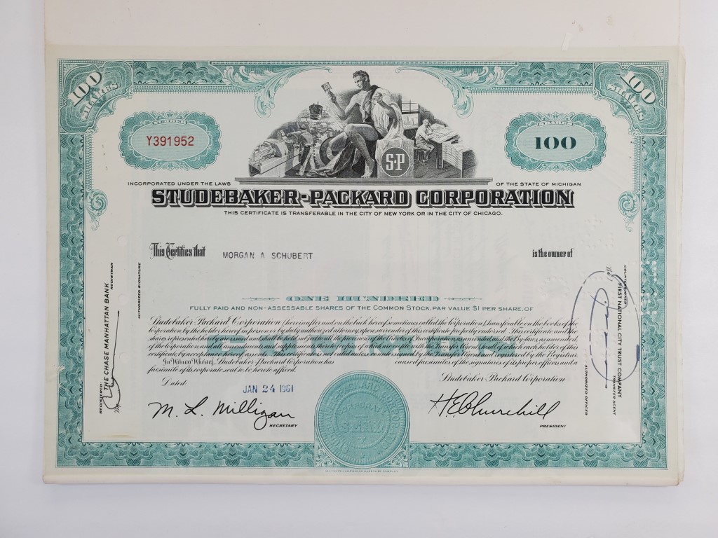 Studebaker-Packard Corporation Common Stock Certificate Dated Jan 1961 100 Shares Each $1 Wall Street Stock Market Collectible
