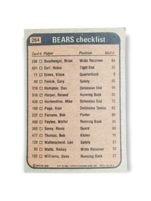 1981 Topps Football Bears Team Checklist #264 Walter Payton / Scott / Hampton